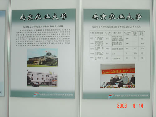 会议期间,为在科技创新和人才培养方面系统展现近年来中国高校与企业合作取得的成绩,体现高校在企业自主创新能力建设中发挥的重要作用,中国高校—大型企业合作论坛组委会从近千项高校与企业申报的材料中精心筛选出的80个典型案例,编写了《中国高校与大型企业合作典型案例集》,我校以“面向‘三农’校企联姻,成果转化一步一阶”为题报送的我校与南京神州种业公司的合作材料荣幸当选;此外,在三个会场上以图文并茂的展板形式展示的20个合作典型案例中,我校与南京神州种业公司的合作也列于其中。近年来,南京神州种业公司作为校办企业在公司领导的有效管理下,扭亏为盈,取得了巨大的经济效益和社会效益,我校转让的水稻、棉花、玉米等品种得到了大面积推广和应用。