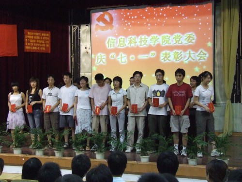 在一年的学习、工作中,在院党委的关怀领导下,我院涌现出一批以沈坤为代表优秀共产党员、以信息51为代表优秀党建班组和以魏定玉为代表的优秀党建班学员。他们在日常的学习、工作中,能够端正思想,切实发挥了党员的先锋模范带头作用。以沈坤为代表的九名优秀共产党员,在担任低年级的副班主任时,切实关心新生的生活、学习和工作,在同学们中树立了良好的形象。伴随着音乐声,获奖人员和获奖班级代表走上了领奖台。同时,高院长和程书记还特别表彰了在党建知识竞赛中获得优秀组织奖的章俐、冯英华和王文娟三位同学。