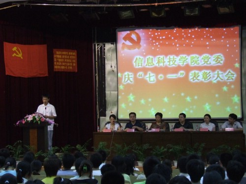 您就像一面鲜明的旗帜,指引万千热血战士,乘风破浪,奋勇前进;您就像不灭的灯塔,漫漫长夜,照亮战士前行的方向。八十五年的历程,见证着您奋斗的足迹;八十五年的沧桑,留下了您坚韧不屈的身影。6月21日下午3:00,为庆祝建党85周年,信息科技学院在大学生活动中心举办庆“七一”表彰大会,院党委书记兼院长高荣华、党委副书记程正芳、副院长梁敬东等六位老师出席了此次大会。