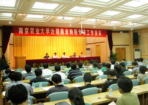 6月21日下午,南京农业大学治理商业贿赂专项工作会议在金陵研究院国际报告厅召开,全体校领导,各单位各部门党政主要负责人,基建处、资产管理与后勤保障处、后勤集团总公司全体科级干部,教务处、图书馆、工学院部分科级干部出席会议。会议主要议题是:学习贯彻中央、教育部、江苏省有关治理商业贿赂的文件精神,研究、动员和部署我校治理商业贿赂专项工作,启动我校治理商业贿赂自查自纠工作。