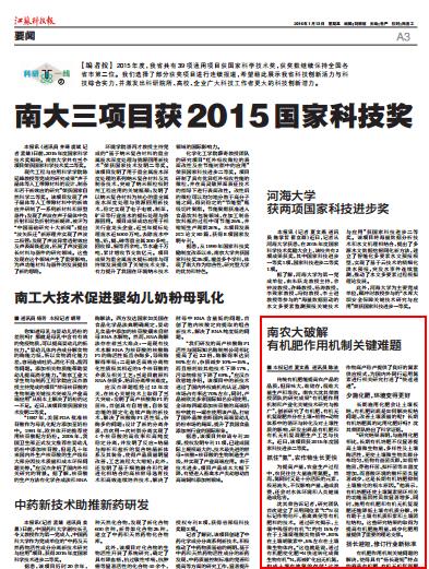 传统有机肥能提高农产品的品质,但异味大,难储存,很难大量生产和堆放。南农大沈其荣教授团队的研究成果“有机肥作用机制和产业化关键技术研究与推广”,创新研究了有机肥、有机无机复混肥养分在土壤-植物-动物体系中的循环与转化及对土壤性质的影响,研发出商品有机肥和有机无机复混肥生产工艺与技术。近日,该项目获2015年度国家科技进步二等奖。
