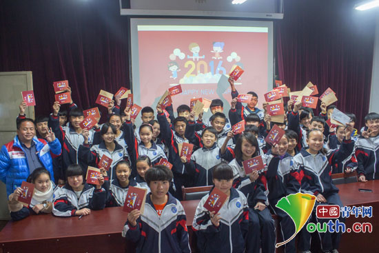 南京农业大学研究生支教团为龙山中学和龙山小学孤儿发放新年红包。
