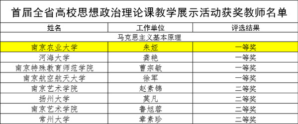日前,江苏省教育厅公布了首届全省高校思想政治理论课教学展示活动的评选结果,马克思主义学院朱娅教授获马克思主义基本原理组一等奖、石诚副教授获新时代中国特色社会主义理论与实践组一等奖。