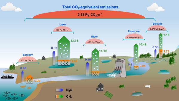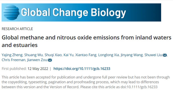 近日,我校资环学院邹建文教授课题组相关研究成果以“Global methane and nitrous oxide emissions from inland waters and estuaries”为题发表在国际全球变化研究领域权威期刊Global Change Biology上。该研究也是课题组近年来围绕流域水体温室气体排放研究在Environmental Science & Technology (2016/2019) 和Agricultural and Forest Meteorology (2021) 等刊物上发表相关结果后的又一重要进展。相关研究为了解不同排放途径(冒泡vs分子扩散)和测定方法学(箱法vs扩散模型法)差异的水体温室气体排放特征及其驱动因子提供了数据支撑,同时也为科学编制全球流域水体温室气体排放清单提供了基本参考。