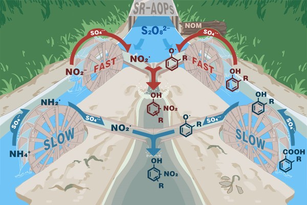 基于硫酸根自由基的高级氧化技术在土壤和地下水污染的原位修复领域具有重要的应用前景。然而,目前学术界和工业界对于这一技术可能存在的问题及局限知之甚少。陆隽鹤教授课题组首次发现,环境中普遍存在的亚硝酸盐和铵盐均能够被硫酸根自由基氧化,生成一系列硝基酚副产物。硝基芳香化合物是一类优先控制污染物,具有持久性和致死、致畸、致突变的“三致”毒性,可对生态系统和人群健康带来潜在风险。近日,团队深入比较了亚硝酸盐和铵盐在硫酸根自由基氧化过程中转化为硝基副产物的机制,发现亚硝酸盐主要导致天然有机质大分子中以酚为特征的快速反应位点的硝基化,而铵盐主要导致以芳香羧酸为特征的慢速反应位点的硝基化。当亚硝酸盐和铵盐共存时,亚硝酸盐和快速位点优先被硫酸根自由基氧化,在反应后期,铵盐和慢速位点同步被氧化。因此,快慢反应位点均能够被有效利用,且产生协同作用。由于环境中亚硝酸盐和铵盐普遍存在,当硫酸根自由基氧化技术用于地下水和土壤污染修复时,硝基副产物二次污染的生成很可能是一个普遍现象。该研究丰富了硫酸根自由基高级氧化反应的理论,并为评估该技术的可行性提供了依据。