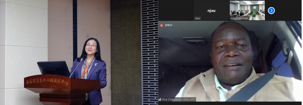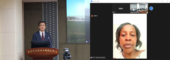 南京农业大学副校长胡锋教授、埃格顿大学科研处处长NancyMungai教授出席开幕式并致辞。胡锋表示,我校历来重视国际交流与合作,特别是与以肯尼亚为代表的非洲国家有着悠久的合作历史和友谊,他感谢联合实验室中肯双方团队的付出,希望继续加强与埃格顿大学的合作,充分发挥联合实验室这一国家级的高水平合作平台,推动中非农业合作持续高质量发展。NancyMungai教授介绍了埃格顿大学与南京农业大学的合作与交流情况,对联合实验室举办的培训班以及中方对埃格顿大学联合实验室建设的帮助表示感谢,希望借此会议进一步增进了解,进一步加强双方合作,特别希望推动科技成果在肯尼亚的示范和转化。中华人民共和国驻肯尼亚大使馆田中先生线上参加会议。南京农业大学科研院院长刘裕强教授、埃格顿大学孔子学院肯方院长JoshuaOgweno教授、中方院长刘玉涛教授、我校援非教师刘高琼教授等参加开幕式。