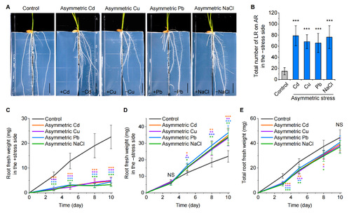 (A) 非对称重金属和盐胁迫下的根系表型;(B) 非对称胁迫引发无胁迫区域根系的侧根加速产生;(C) 胁迫一侧根系生物量的积累基本停滞;(D) 在无胁迫一侧,根系生物量迅速增加;(E) 非对称胁迫下,两侧根系总生物量逐渐接近对照组。