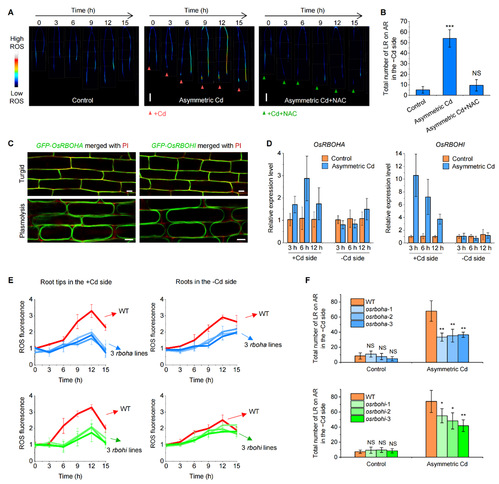 (A) 非对称镉胁迫诱发根尖ROS响应并激活系统性ROS信号; (B) ROS清除剂抑制根系规避非对称镉胁迫的作用;(C) OsRBOHA与OsRBOHI定位于细胞质膜;(D) 镉胁迫诱导OsRBOHA与OsRBOHI转录上调;(E) and (F) OsRBOHA与OsRBOHI参与ROS介导根系规避非对称镉胁迫。