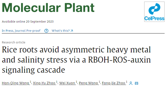 近日,Molecular Plant在线发表了南京农业大学赵方杰教授团队题为“Rice roots avoid asymmetric heavy metal and salinity stress via a RBOH-ROS-auxin signaling cascade”的研究论文,揭示了水稻根系通过呼吸氧爆发同源酶-活性氧-生长素(RBOH-ROS-Auxin)的信号通路,重塑根系构型以规避局部的重金属和盐胁迫。