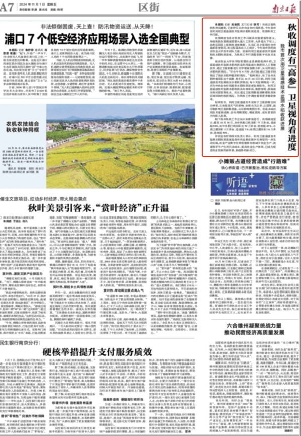 南京农业大学农学院智慧农业系教授程涛介绍,卫星遥感技术监测水稻收获是利用遥感大数据和人工智能技术,通过卫星影像进行光学植被指数分析,从而判别出水稻收获情况。“早在今年8月份,我们就通过卫星识别得出了南京水稻种植面积情况。”程涛表示,有了全市水稻种植面积这个底数,他们从10月20日开始,利用卫星遥感技术监测南京水稻收获情况,每5天监测调度一次,并为市农业农村局提供水稻收获进度监测报告。利用卫星遥感技术监测水稻收获具有效率高、数据客观、获取成本相对更低等优点,而且通过卫星图像能清晰看到具体区域田块的收获情况,为秋收工作调度提供更多辅助参考。