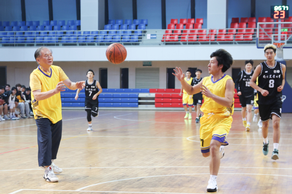 开赛前,沈其荣院士与新生篮球队代表互赠球衣。“嘟——!”随着开球哨响,有机肥团队与新生联队的篮球赛在欢呼声中开场,两支球队你拼我抢、酣畅激烈。接球、起跳、投篮、命中,现场新生为院士的矫健身手、与队友的默契配合鼓掌喝彩。随着最后一声哨响,沈其荣出压哨三分球,球在最后一刻进入篮筐,“沈院士的第九个三分!”燃爆全场气氛。