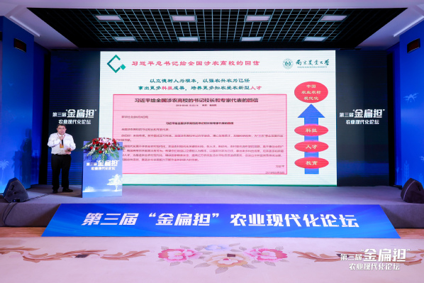 董维春的演讲从习近平总书记强调新质生产力和给全国涉农高校重要回信开始,阐述了“农业农村现代化关键在科技、在人才,基础在教育”的逻辑关系,回顾了原始农业、传统农业到现代农业的生产力演变,总结了产业革命后高等农业教育的产生与发展规律。演讲中,董维春介绍了我校“通专结合”模式培养拔尖创新人才的新思路,包括农业特色通识教育(南农八门课)和金善宝书院;介绍了我校与CCTV-17合作的“最炫农科生”集结仪式,在“希望的田野”上展现新时代农科生风采。演讲中,董维春强调中国古代曾经是世界头号农业强国,但以小农户经济及其配套的生产技术为主,未能及时跟上近代科学革命和产业革命的步伐;在新的发展理念下,新农科建设要适应粮食安全、乡村振兴、生态文明、美丽中国等重大战略需求,正确处理扎根中国大地与借鉴世界经验的重大关系,读懂中国式现代化,通过创新发展,拿出更多科技成果、培养更多知农爱农新型人才,赋能农业新质生产力,为农业强国建设提供科技和人才支撑。