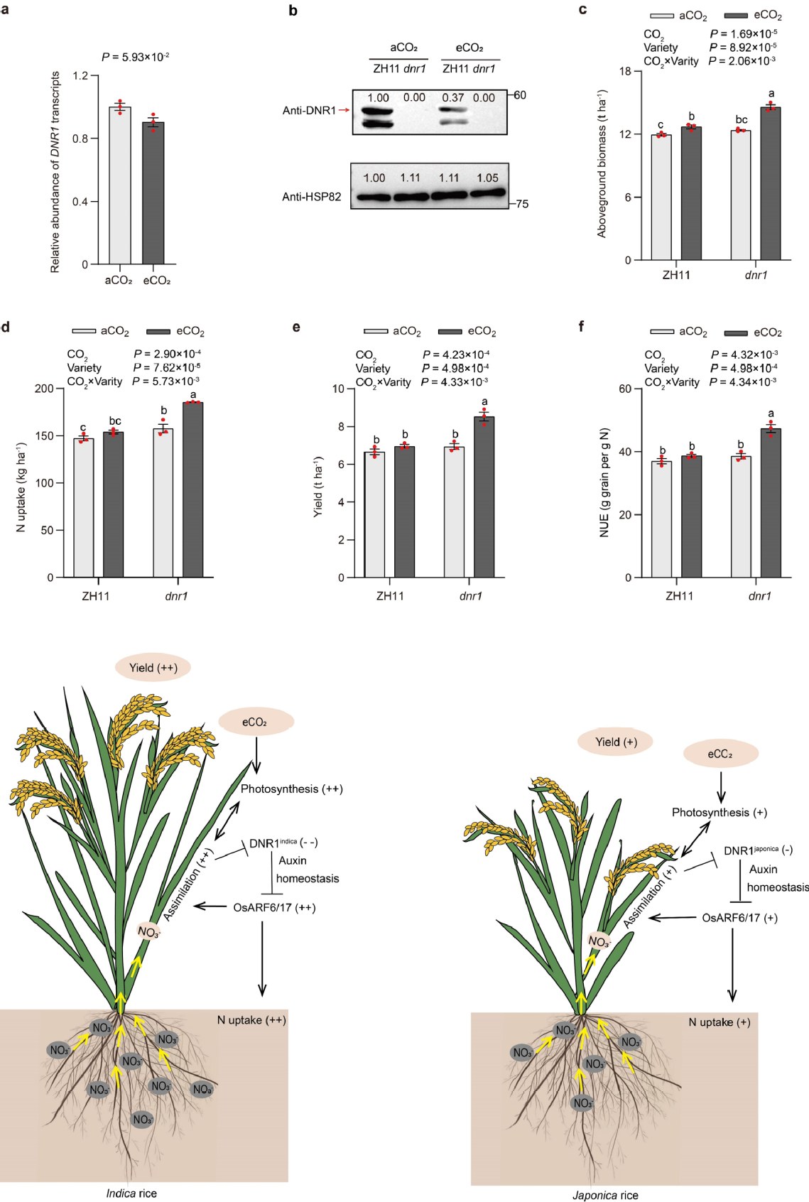 为了验证这一假设,在FACE平台利用DNR1近等基因系和突变体开展田间试验发现,携带籼稻DNR1(硝态氮吸收高)水稻在大气CO2浓度升高下产量增幅达到22.8–32.3%,但携带粳稻DNR1(硝态氮吸收低)水稻的产量仅增加3.6–11.1%。其机制是:在携带籼稻DNR1的植株中,大气CO2浓度升高大幅降低了DNR1的积累,合成了更多生长素,招募了更多的OsARF6和OsARF17,上调了参与硝态氮代谢相关基因的表达(OsNRT1.1B、OsNRT2.3a、OsNIA2和OsNPF2.4),增加了对硝态氮的吸收和同化,从而大幅增强了叶片光合基因(OsPsaB、OsRbcs和OsSBPase)的表达和光合速率。研究结果证实了籼稻对大气CO2浓度升高的响应更高与硝态氮吸收能力更强有关,籼稻DNR1基因可作为提高粳稻产量和氮肥利用效率的关键育种资源,尤其是在大气CO2浓度持续升高的背景下。