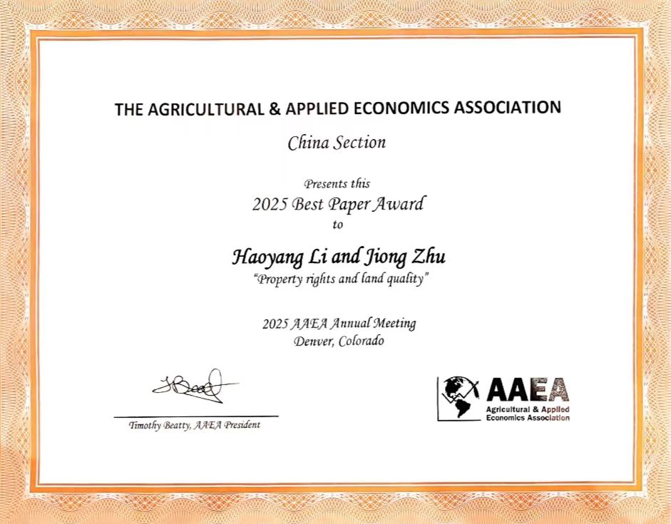 近日,美国农业与应用经济学会中国分会公布了2025年最佳论文奖,南京农业大学经济管理学院李昊洋教授的合作论文《Property Rights and Land Quality》获此奖项。