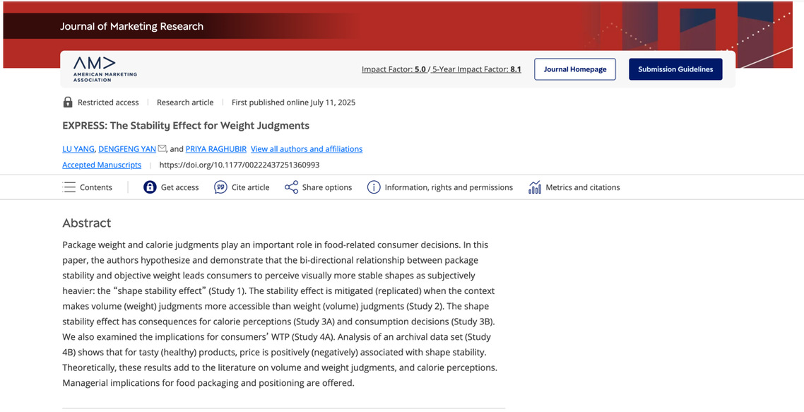 重量与卡路里判断在食品消费决策中至关重要。该论文探讨了形状稳定性如何影响消费者对重量和卡路里判断以及后续的消费决策。通过实验研究,论文发现消费者会通过形状稳定性来推测产品重量,也即视觉上更稳定的形状会让消费者主观感知更重,并进一步影响后续消费者决策。与此同时,文章进一步发现当容量判断比重量判断更可及时,“形状稳定性效应”会被削弱。该研究对感官营销、卡路里判断方面的文献进行了有意义的补充和扩展,同时也对食品包装、市场定位与产品设计等方面有较为重要的实践意义。