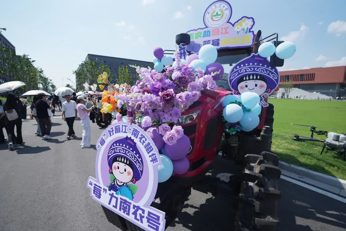 主花车“‘菊’世无双号”聚焦学校拥有的全球最大菊花种质资源库,呈现引领产业升级的绿色栽培技术和自主培育的茶用菊“南农金菊”等新品种,彰显菊花产业助力乡村振兴与脱贫攻坚的时代价值。“‘钳’力以赴号”围绕资产经营公司打造的金秋螃蟹产品设计,凸显“生态优先、绿色发展”的理念;“‘稻’梦空间号”以优质大米为核心元素,诠释“科技赋能、粮稳天下”的愿景;“‘莓’力南农号”直观展现学校十余年科技帮扶贵州麻江成果,象征“山海相连、共富同行”的实践路径;“工造未来号”则以工学院创新作品为主体,展示智慧农业装备在现代农业中的蓬勃前景。