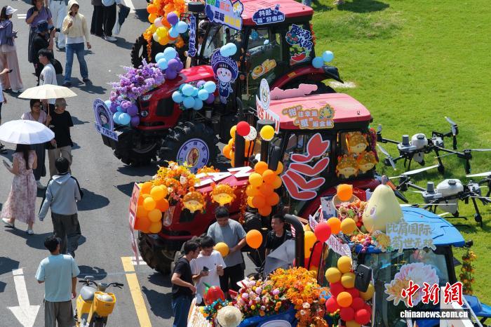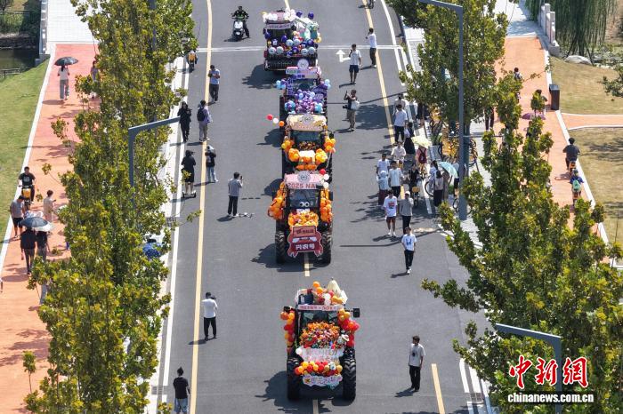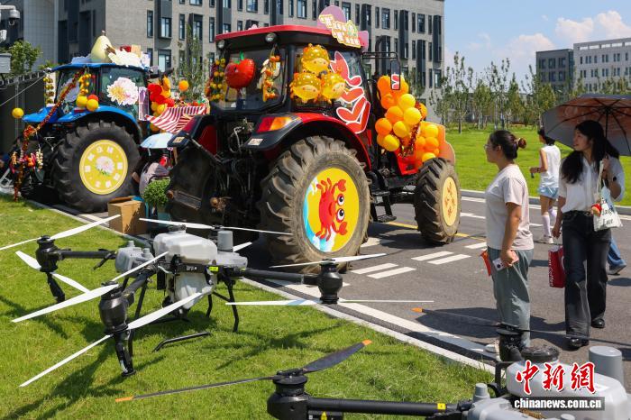 9月16日,在第八个中国农民丰收节即将到来之际,南京农业大学举办别开生面的“科研展陈+花车巡游”主题活动,“‘菊’世无双号”“‘钳’力以赴号”“‘稻’梦空间号”“‘莓’力南农号”“工造未来号”等寓意着“五谷丰登”的主题花车依次亮相在校园大道上,将科技创新与乡土风情巧妙融合,共庆丰收盛景。图为花车吸引师生们前来欣赏。(无人机照片)中新社记者 泱波 摄