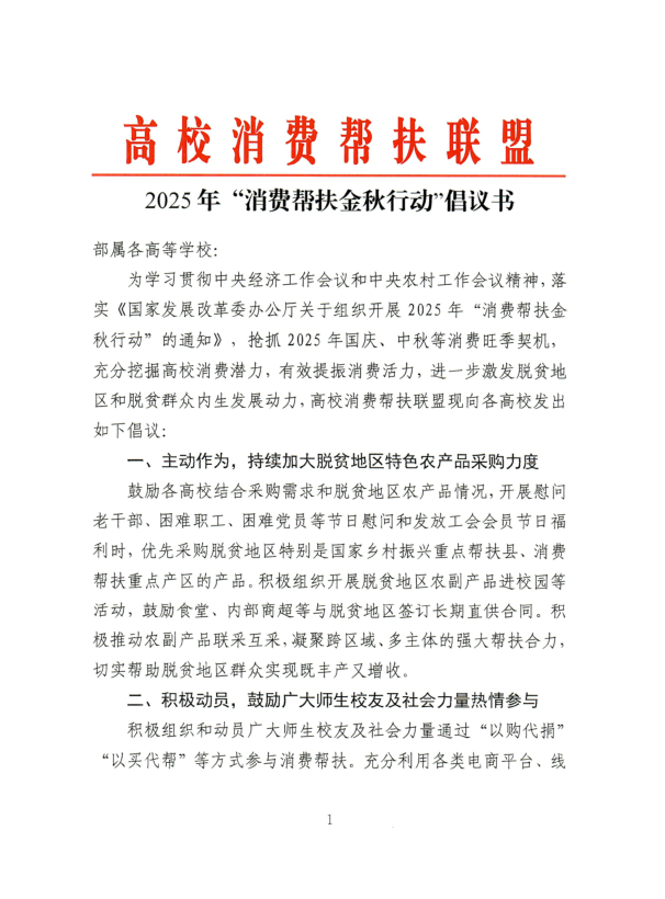 为深入学习贯彻中央经济工作会议和中央农村工作会议精神,按照《国家发展改革委办公厅关于组织开展2025年“消费帮扶金秋行动”的通知》要求:各高校要结合采购需求和脱贫地区农产品情况以及脱贫地区特色文旅资源,组织和动员师生校友积极参与对脱贫地区的消费帮扶和旅游帮扶,持续加大脱贫地区特色农产品消费采购力度,鼓励赴脱贫地区开展旅游消费。现向全校发起“消费帮扶金秋行动”倡议,倡议全体师生员工及广大校友,在2025年10月20日前,积极使用线上网络平台下单购买和集中采购我校定点帮扶贵州省麻江县农特产品,持续推动我校消费帮扶助力麻江等帮扶地区乡村振兴。