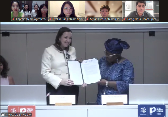 决赛由WTO总干事恩戈齐·奥孔乔-伊韦阿拉(Ngozi Okonjo-Iweala)主持,评审团由来自智利、吉布提、菲律宾、南非和瑞士的五位常驻WTO大使组成。在决赛环节,Agro-Strategos团队方案紧扣WTO出口限制规则改革,重点探究如何应对全球危机时期粮食贸易阻碍、提升进口国的贸易可预测性,获得评委高度认可,最终荣获赛事季军。本次竞赛中,瑞士日内瓦高级国际关系及发展学院团队获得冠军,意大利欧洲大学学院与新加坡南洋理工大学联合团队获得亚军。