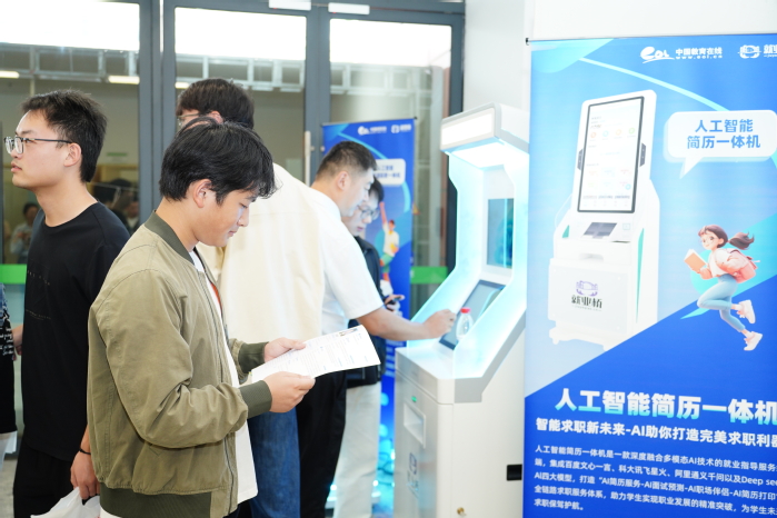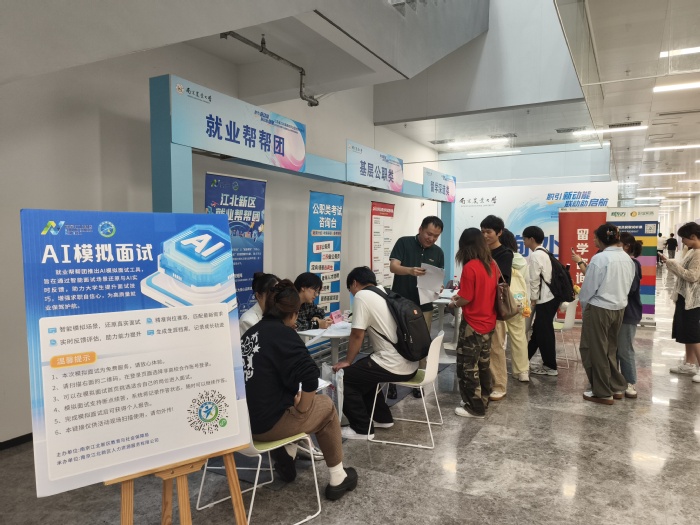 招聘会场外设有公共服务区,联合中国教育在线配备了一体化AI求职指导设备,提供简历诊断、模拟面试等服务,助力毕业生提升求职竞争力。学校还与江北新区“就业帮帮团”联合设立咨询服务点,为毕业生提供简历修改、岗位推荐、公职报考政策解读及留学规划等全方位支持。