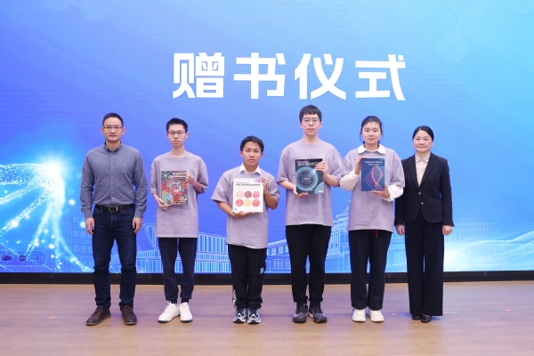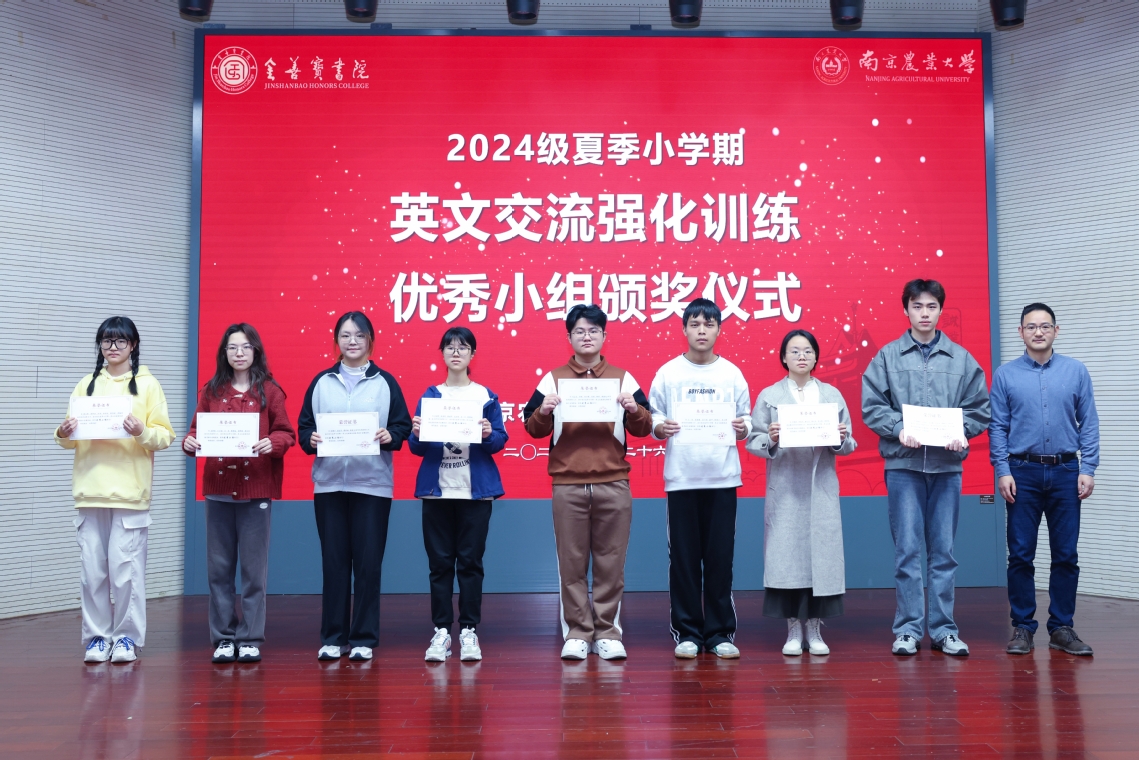 教务处处长曹爱忠、学生工作处副处长(主持工作)施雪钢为拔尖基地班学生代表赠送英文原版教材,助力学生拓宽学术视野。金善宝书院新生大会还表彰了2024级夏季小学期英文交流强化训练优秀小组,激励学生持续提升跨文化交流能力。