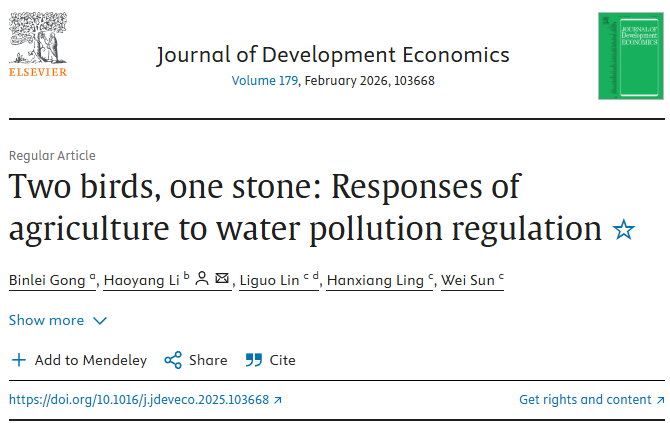 近日,南京农业大学经管学院教授李昊洋作为通讯作者,与浙江大学龚斌磊教授、上海财经大学林立国教授、孙韦副教授,以及硕士毕业生凌翰翔合作撰写的论文 “Two Birds, One Stone: Responses of Agriculture to Water Pollution Regulation”在发展经济学国际顶级期刊《Journal of Development Economics》上正式发表。