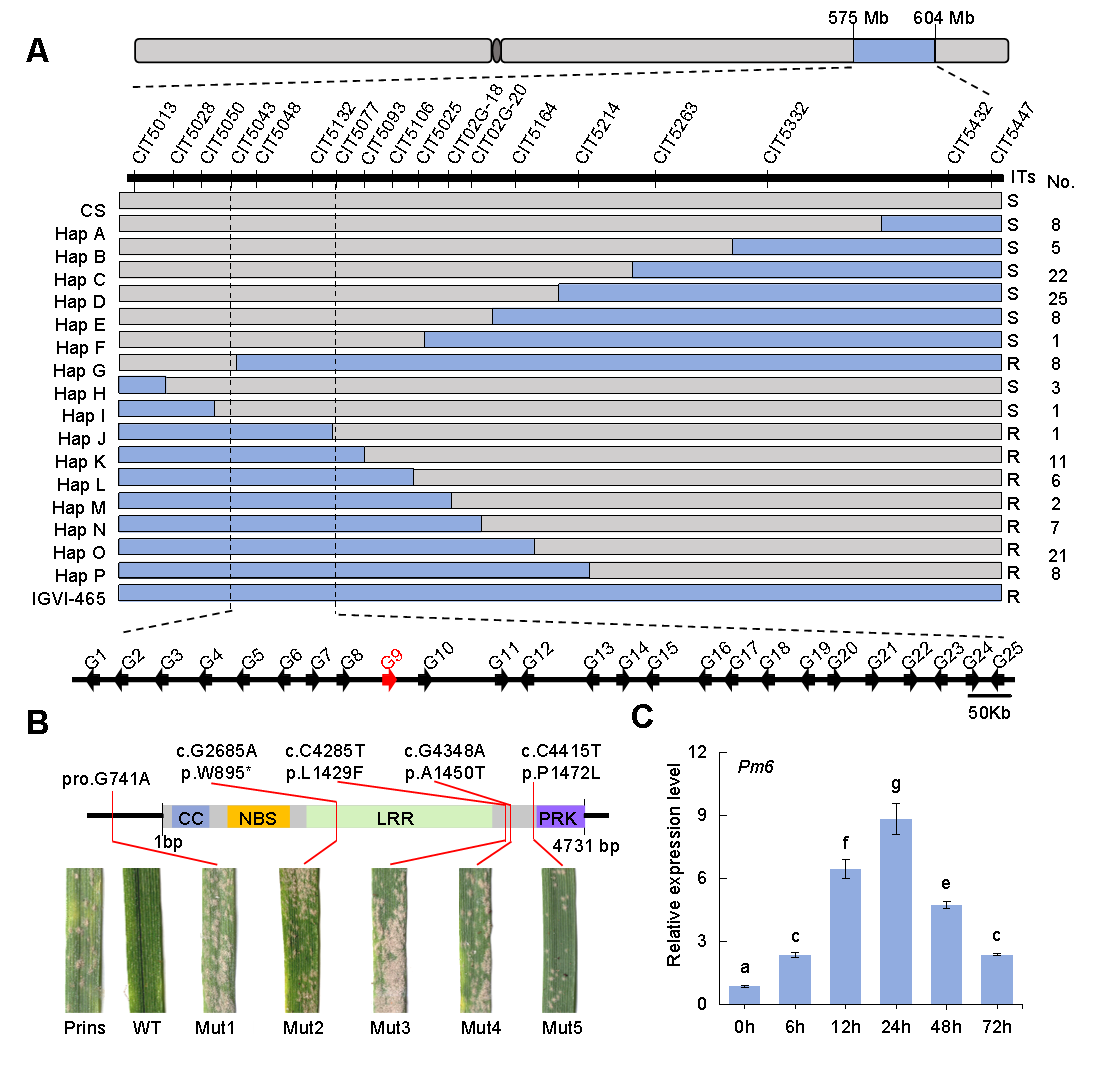 小麦白粉病是由专性寄生真菌Blumeria graminis f. sp. tritici(Bgt)引起的全球性重大病害,严重威胁小麦生产。截至目前克隆了近30个白粉病抗性基因(Zhang et al. 2025),但尚无来自G基因组抗白粉病基因被克隆;由于仅发现了5个抗白粉病基因的病原菌效应因子(Muller et al., 2022),白粉病抗性基因识别病原菌的分子机制仍不清楚。提莫菲维小麦(Triticum timopheevii,2n=28,AAGG)是小麦抗病育种的重要基因库,迄今发现的提莫菲维小麦抗病基因包括抗白粉病基因Pm6、Pm27、和Pm37,抗叶锈病基因Lr50,抗秆锈病基因Sr36和Sr37等。提莫菲维小麦与栽培小麦具有相同的A基因组以及与栽培小麦B相近的G基因组,其优异基因可以通过有性杂交、遗传重组等方式被转移和利用。来自提莫菲维小麦的抗白粉病基因Pm6是小麦育种的重要抗源,但由于两个亚基因组分化导致遗传重组抑制,精细定位和克隆非常困难。