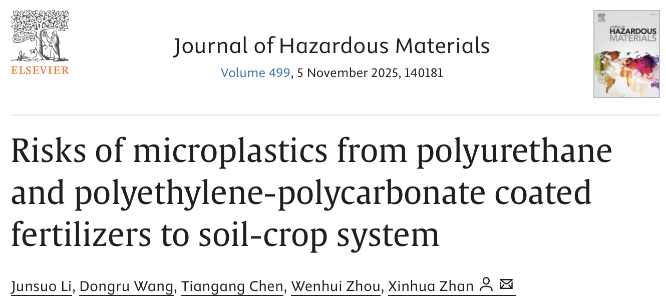 近日,南京农业大学资环学院占新华教授团队在国际权威期刊《Journal of Hazardous Materials》上发表了题为“Risks of microplastics from polyurethane and polyethylene-polycarbonate coated fertilizers to soil-crop system”的研究论文,揭示了包膜肥源微塑料对作物生长及土壤生态功能的多维影响机制,为包膜肥的环境安全评估及农业绿色可持续发展提供了科学依据。