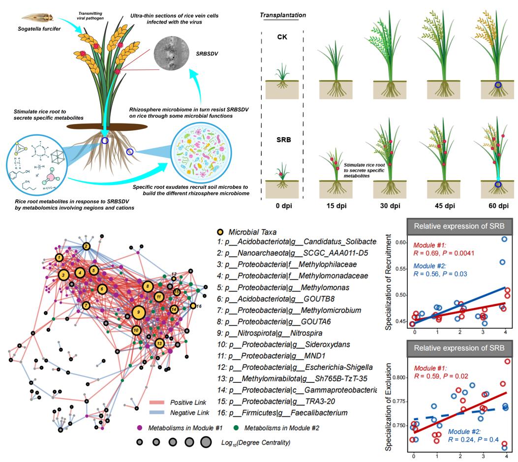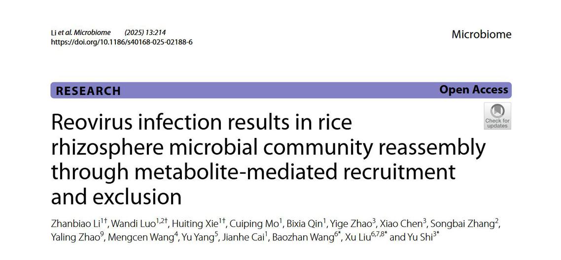 近日,南京农业大学生命科学学院王保战教授课题组联合河南大学、广西农科院等单位,在微生物学顶级期刊《Microbiome》发表题为“Reovirus infection results in rice rhizosphere microbial community reassembly through metabolite-mediated recruitment and exclusion”的研究论文。该研究揭示了虫媒病毒可通过调控植物根系代谢物组成,选择性招募或排斥关键微生物类群,从而重塑水稻根际微生物群落结构与功能,为通过微生物组调控提升作物健康提供了新思路。