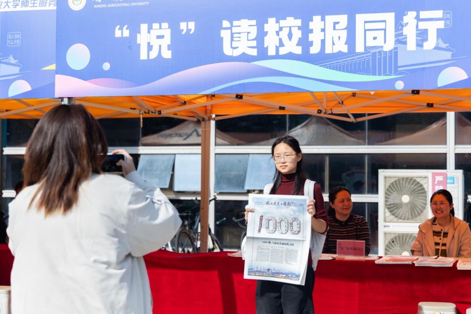 “悦” 读校报同行专区前,《南京农业大学报》第1000期至1008期报纸整齐陈列,读者们细细翻阅,在版面中寻找熟悉的身影与故事。