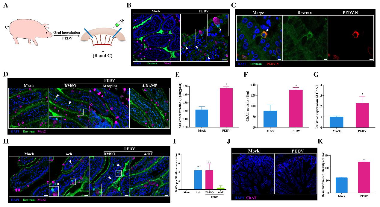 在肠道黏膜中,研究揭示了PEDV更为独特的致病机制。PEDV可通过激活黏膜下神经元的乙酰胆碱-CHRM3信号通路,诱导杯状细胞形成GAP(Goblet Cell–Associated Antigen Passage)通道。这一用于递送食物抗原、维持免疫耐受的生理通道在PEDV感染后出现“用途转移”——即便肠道上皮结构仍完整,肠道细菌也可通过GAP进入固有层,引发炎症反应,从而加剧肠道损伤并促进病毒扩增。值得注意的是,阻断CHRM3信号可显著抑制GAP形成,感染仔猪的腹泻、体重下降和组织病变均明显减轻,证明GAP在PEDV高致病性中的关键作用。