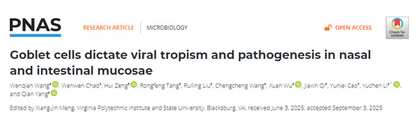 近日,南京农业大学动物医学院杨倩教授团队在国际著名期刊《Proceedings of the National Academy of Sciences》发表了题为“Goblet cells dictate viral tropism and pathogenesis in nasal and intestinal mucosae”的研究论文。该研究以猪流感病毒(SIV)和猪流行性腹泻病毒(PEDV)为模型,系统阐明了杯状细胞在病毒黏膜感染过程中的核心调控作用,揭示了不同黏膜组织中病毒嗜性和致病结果截然不同的关键宿主机制。