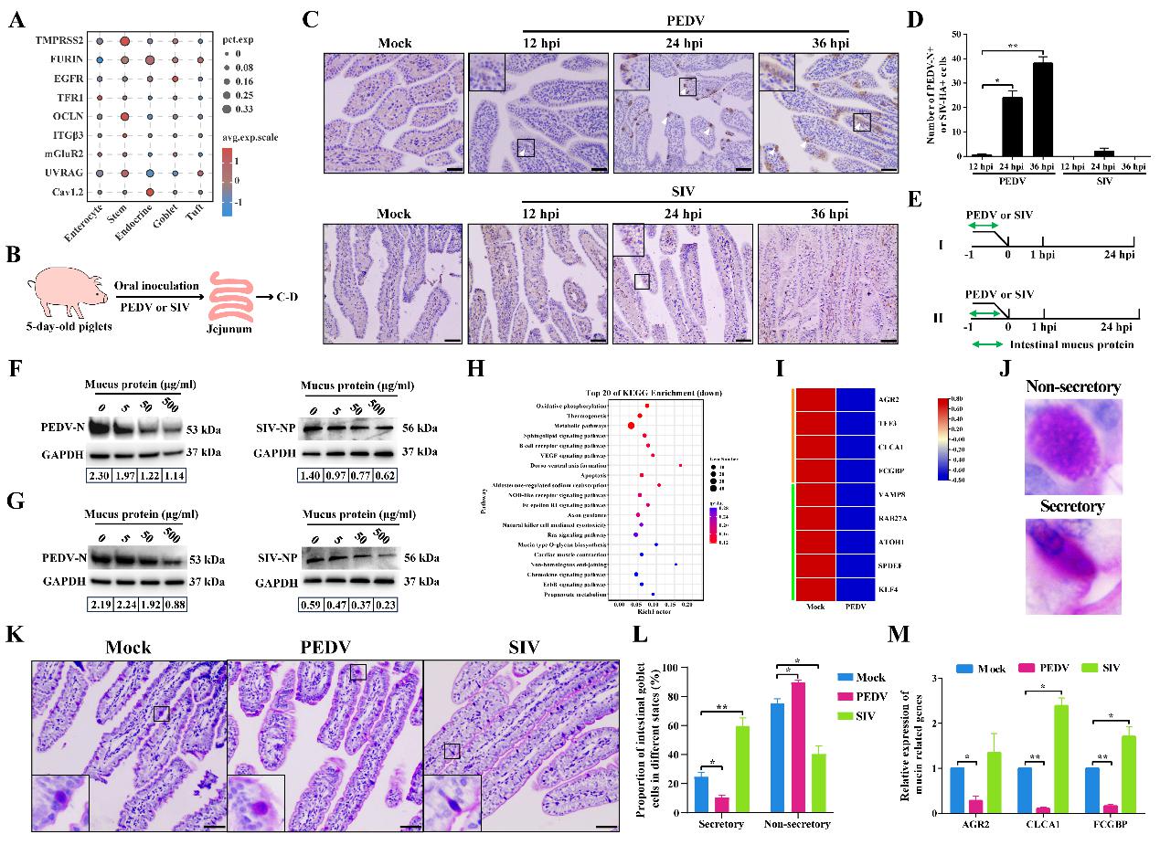 图1.杯状细胞黏液分泌功能影响PEDV和SIV在肠道黏膜的嗜性