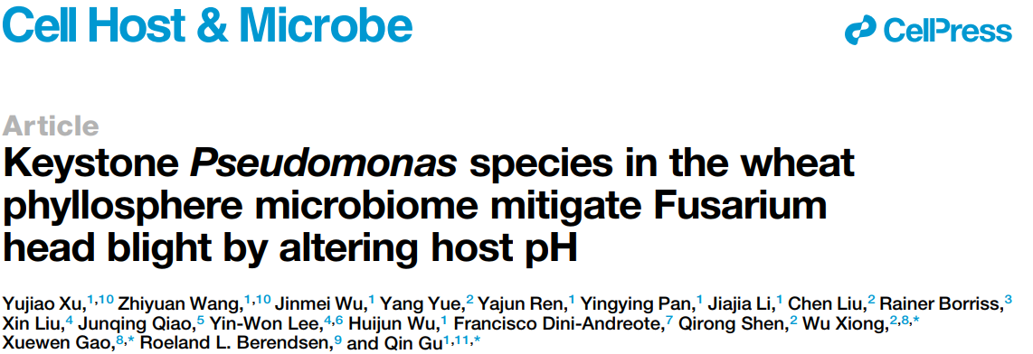 11月20日,南京农业大学植物保护学院、农林生物安全全国重点实验室高学文、顾沁教授团队在《Cell Host & Microbe》上发表题为“KeystonePseudomonasspecies in the wheat phyllosphere microbiome mitigate Fusarium head blight by altering host pH”的研究论文。小麦赤霉病是威胁全球农业生物安全的重大真菌病害,研究发现赤霉病菌侵染小麦时,会通过诱导寄主碱化来增强自身致病力。与此同时,小麦穗部的天然微生物群落中潜藏着一类能够“以酸制碱”的守护者——寄主酸化型假单胞菌。这些细菌在赤霉病菌侵入时被招募至麦穗,分泌有机酸降低病原菌诱导的寄主碱化效应,从而有效抑制赤霉病发生。该发现揭示了寄主、病原菌与有益微生物间围绕pH的精妙博弈,并展示了通过调控寄主微环境实现作物绿色防控的新思路。