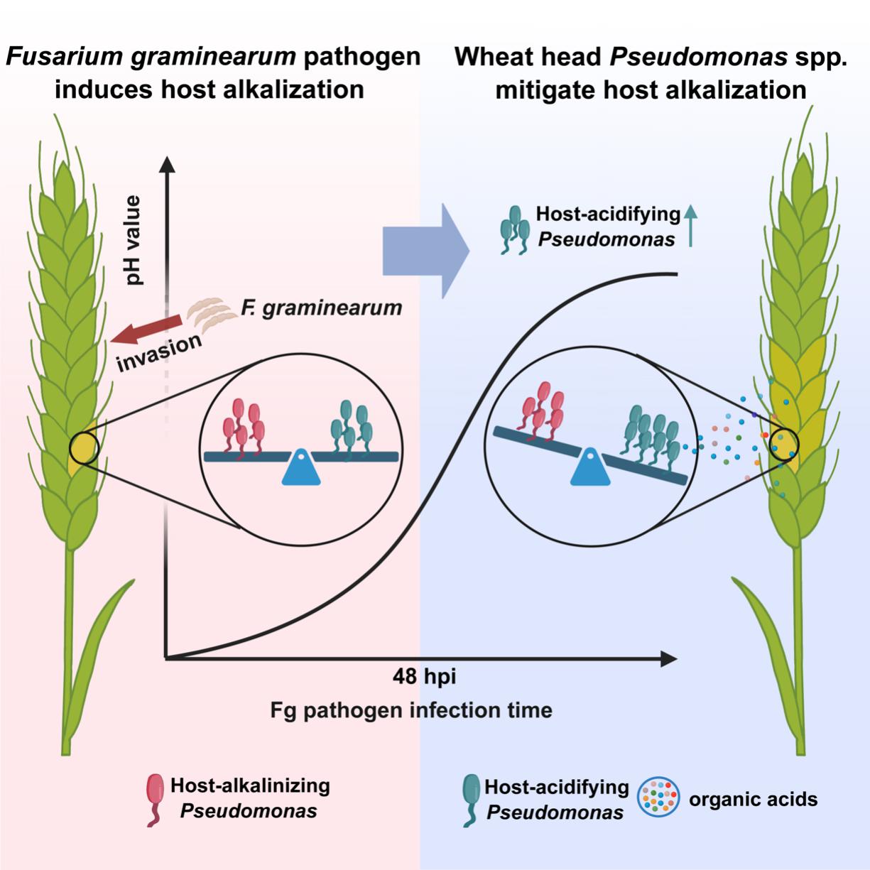 近年来,由于气候变化、大面积小麦/玉米轮作和秸秆还田等因素的影响,赤霉病在我国呈加重发生态势,严重威胁我国农业生物安全和粮食安全。在该研究中,作者揭示了小麦穗部微生物群落在病原菌侵染过程中通过调控寄主局部pH参与病害进程的关键微生态机制。研究发现,赤霉病菌侵染小麦穗部时,会通过诱导寄主组织碱化来增强其致病力。而有趣的是,小麦穗部天然微生物群中潜伏着一类能够“以酸制碱”的功能微生物——寄主酸化型假单胞菌。随着病原菌的侵入,这类假单胞菌在穗部富集,并通过分泌多种有机酸降低病原菌诱导的寄主碱化效应,从而抑制赤霉病发生。