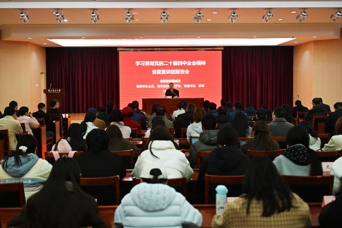 11月21日,省委宣讲团成员,省农业农村厅党组书记、厅长季辉走进南京农业大学,为全校师生和全省农业农村系统干部宣讲党的二十届四中全会精神。校党委常委吴群参加会议并陪同调研。各学院、各单位负责人和领导班子成员、民主党派代表、思想政治理论课教师,卫岗校区各学院师生代表现场聆听报告。