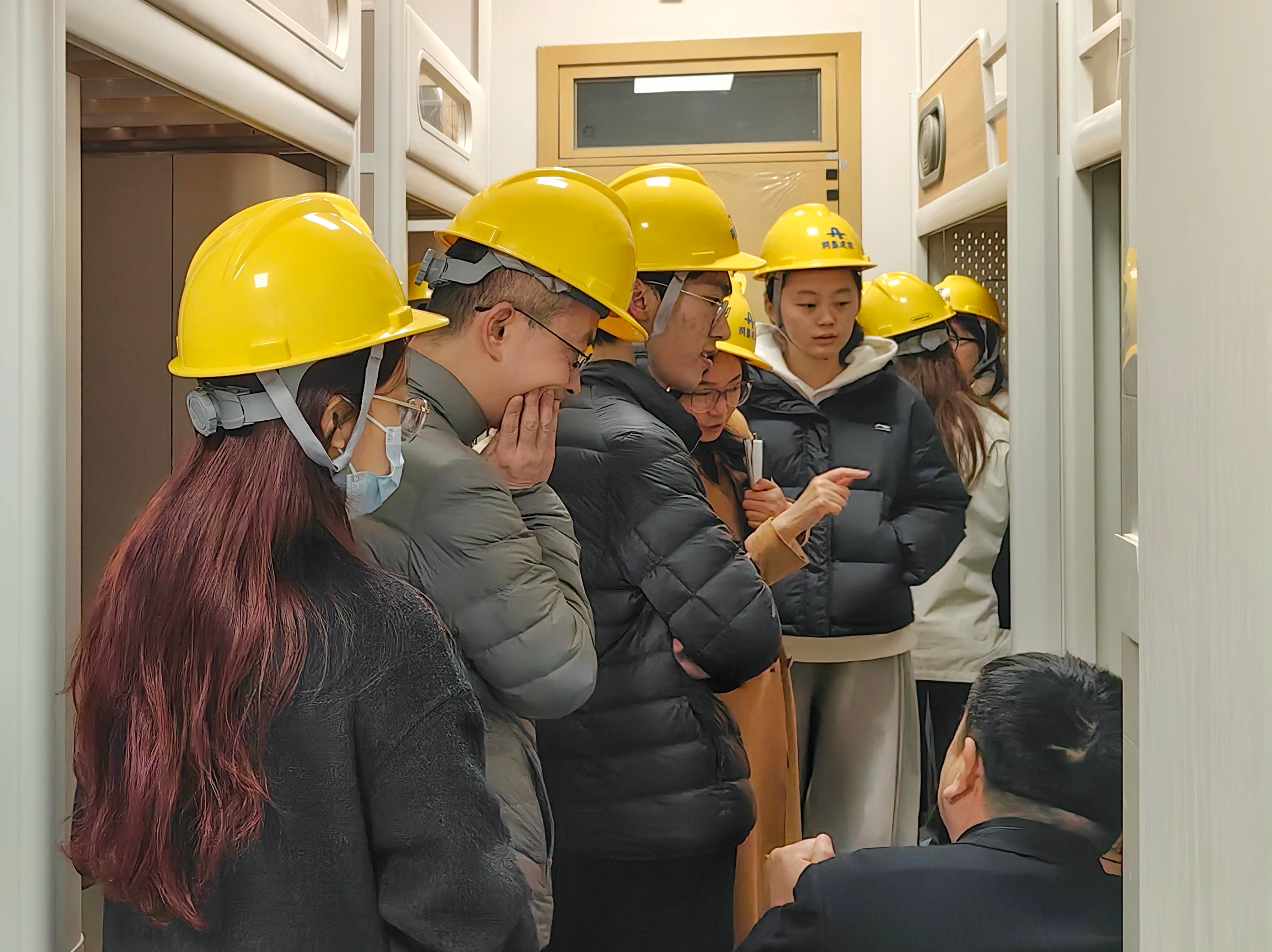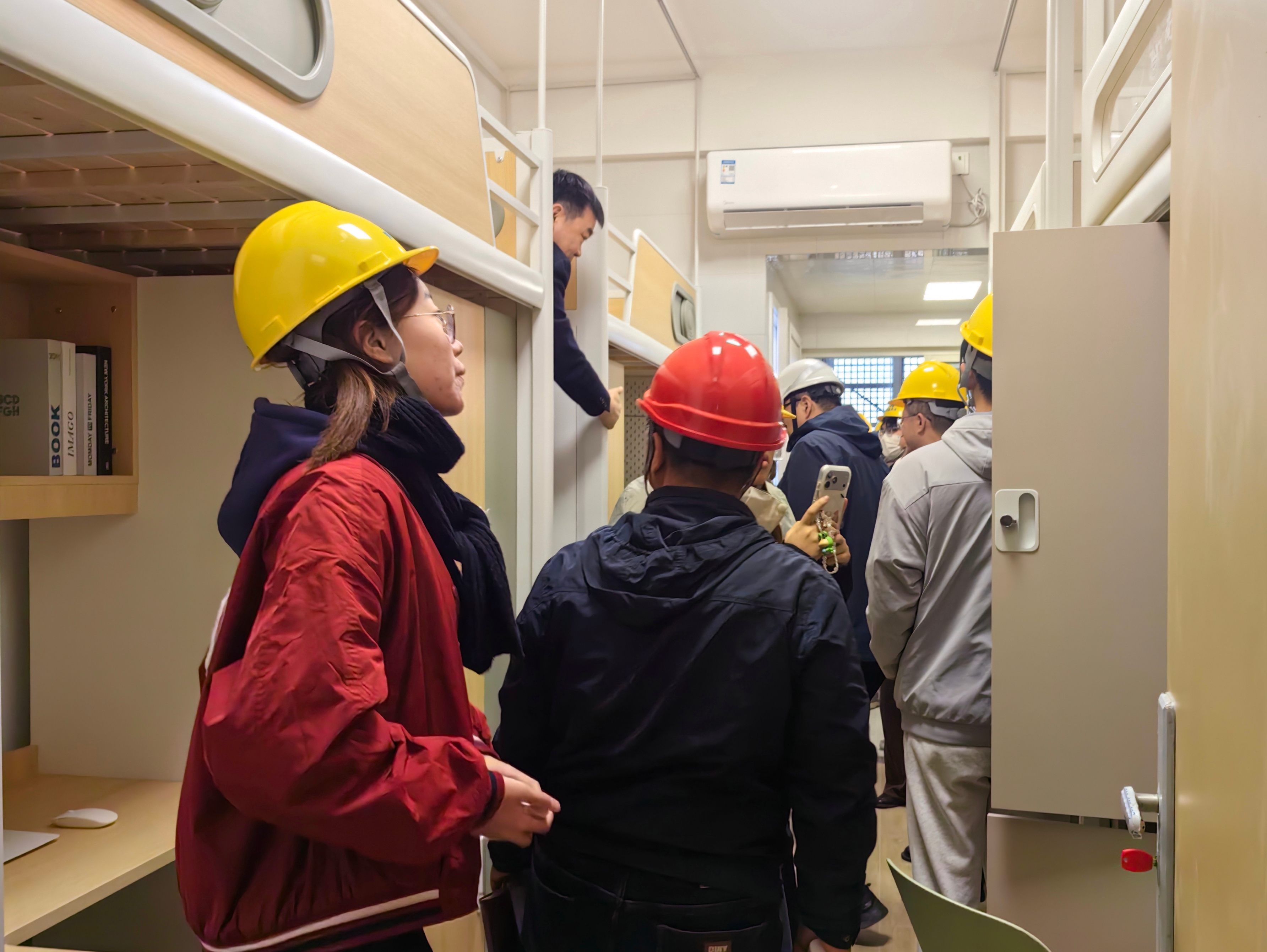 在样板间现场,师生代表们在工作人员的引导下有序参观体验。大家满怀欣喜地“解锁”新宿舍的结构布局,一边倾听工作人员讲解,一边体验室内各项家具设施的舒适度和便捷性。