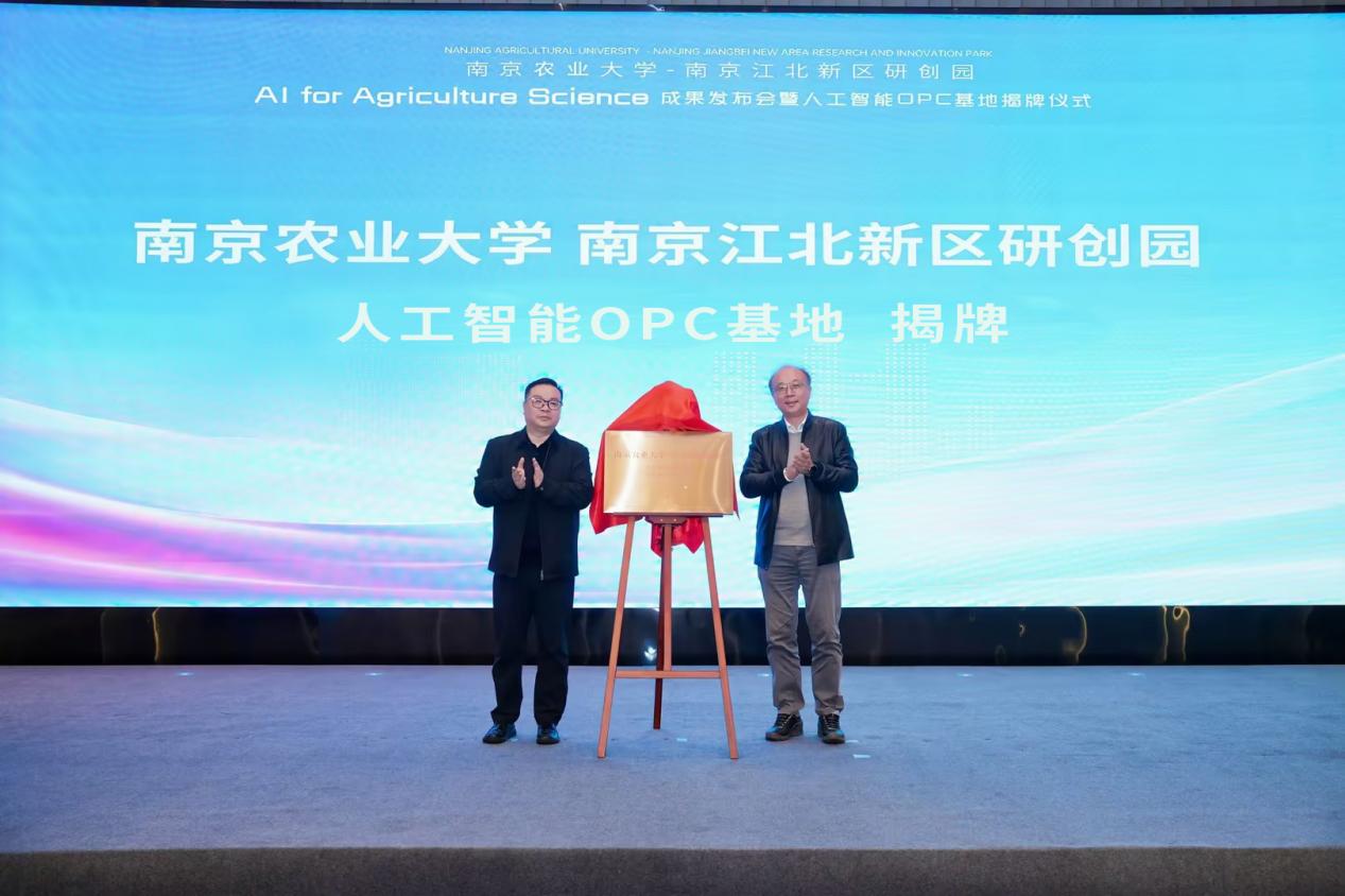 发布会现场,丁艳锋与江北新区研创园党工委书记、管办主任吴恒共同为“南京农业大学-南京江北新区研创园人工智能OPC基地(AI for Agriculture Science)”揭牌。该基地聚焦AI与农业科学交叉领域,将推动技术攻关、成果转化与人才集聚,构建产学研用一体化平台,为校地合作提供产业视角与应用场景。