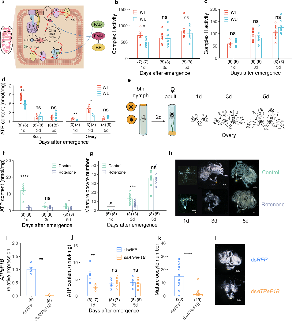 本研究通过观察感染与未感染Wolbachia的灰飞虱在整个产卵周期内的产卵表现,发现Wolbachia提高产卵量的关键机制之一,它能够加速初羽化雌虫的卵巢发育,促使它们更早产卵,并提前迎来产卵高峰期。转录组分析结果显示,Wolbachia能系统性激活宿主的能量代谢通路,为卵巢发育以及卵母细胞的成熟提供能量支持。进一步研究发现,Wolbachia通过提升初羽化雌虫线粒体复合体I的活性,增强了氧化磷酸化的效率,进而提高了卵巢发育阶段线粒体的产能。而抑制线粒体产能,则会明显干扰卵巢发育,这充分说明Wolbachia是通过增强初羽化灰飞虱的产能,来推动卵巢发育的。