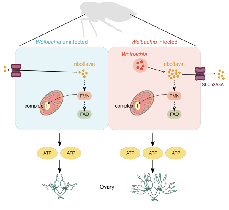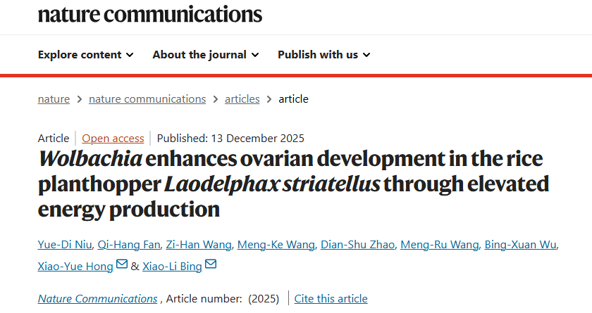 近日,南京农业大学植物保护学院洪晓月教授团队在国际权威学术期刊《自然・通讯》(Nature Communications)发表了题为 “Wolbachia enhances ovarian development in the rice planthopper Laodelphax striatellus through elevated energy production”的研究论文,深入解析内共生菌Wolbachia(沃尔巴克氏体)通过合成核黄素来调控宿主能量代谢,进而加速卵巢成熟、增强宿主繁殖力的分子机制。研究明确了营养供给在内共生关系维持中的关键作用,为进一步理解内共生菌与宿主间的代谢互作提供了全新视角。