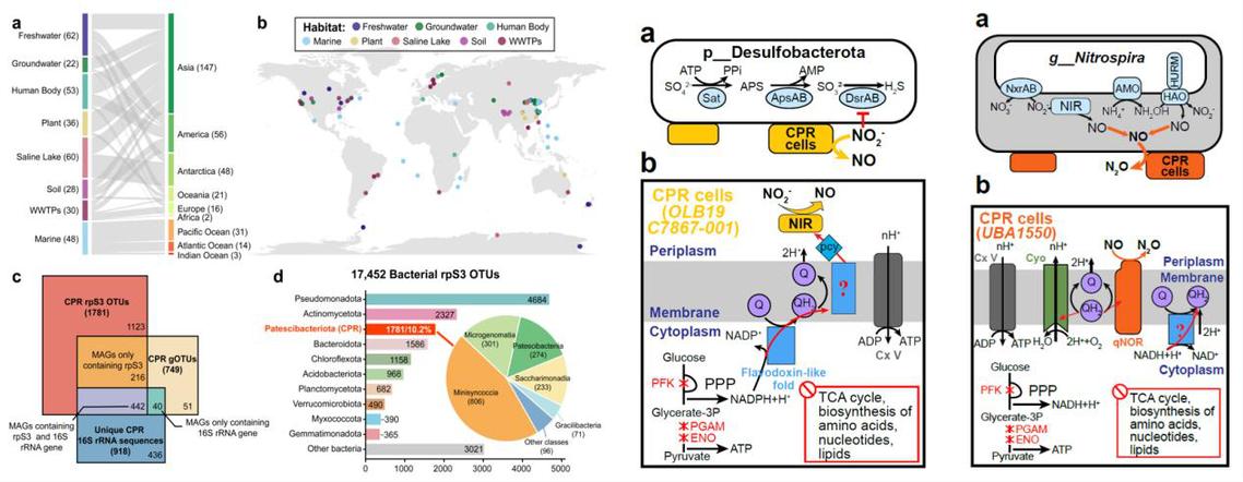 Patescibacteriota(亦称候选门级辐射类群,CPR)是一类细胞极小、基因组严重缩减且缺乏独立生物合成能力的特殊细菌类群,通常以附生(epibiotic)方式依赖宿主生存,是“微生物暗物质”的重要组成部分。由于其16S rRNA基因存在大量特殊的插入序列,并且难以被传统通用引物有效扩增,导致传统扩增子测序技术严重低估了其多样性,学界对其全球分布格局及与宿主的功能互作机制知之甚少。研究团队利用核糖体蛋白S3(rpS3)作为稳健的系统发育标记,克服了传统方法的局限。通过整合全球尺度多生境的13.9 Tb宏基因组数据及4645个基因组(MAGs),系统评估了Patescibacteriota的全球多样性。结果显示,Patescibacteriota是仅次于变形菌门和放线菌门的全球第三大细菌门类,其群落结构具有显著的生境特异性,特别是在地下水和污水处理厂环境中表现出极高的丰度和多样性。进一步,通过共现网络分析与基因组代谢潜能挖掘,研究团队揭示了Patescibacteriota与宿主细菌之间存在特定的“代谢互补”机制,可能通过代谢级联效应介导功能协同。具体而言,在高亚硝环境中,编码亚硝酸盐还原酶(NirK)的Patescibacteriota倾向于与硫酸盐还原菌(Desulfobacterota)共存,通过协助宿主将亚硝酸盐还原为一氧化氮(并泵出细胞),从而缓解亚硝酸盐对硫酸盐还原过程的抑制;而在硝化作用活跃的系统中,编码一氧化氮还原酶(NorB)的Patescibacteriota则主要与全程氨氧化菌(Nitrospira中的一个独特类群)互作,通过消除代谢副产物NO的毒性,维持宿主的代谢活性。