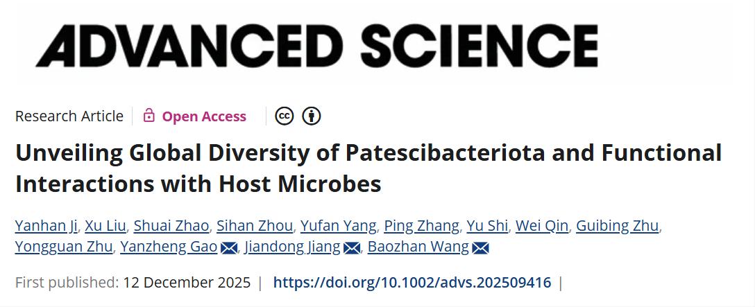 近日,南京农业大学生命科学学院蒋建东教授、王保战教授团队联合资源与环境科学学院高彦征教授团队,在《Advanced Science》发表了题为“Unveiling Global Diversity of Patescibacteriota and Functional Interactions with Host Microbes”的研究性论文。该研究建立了基于核糖体蛋白S3(rpS3)的系统发育分析新框架,绘制了超微细菌Patescibacteriota的全球分布图谱,并揭示了Patescibacteriota通过协同代谢增强宿主环境适应性并参与全球生物地球化学循环的生态学新机制。