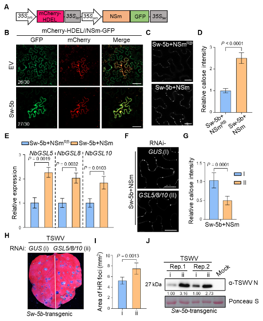 番茄Sw-5b为N端带有额外茄科特有的SD结构域(Solanaceae domain)的NLR免疫受体,Sw-5b被广泛用于番茄斑萎病毒(tomato spotted wilt orthotospovirus,TSWV)--一种具有高度危险性的植物病毒--的抗病育种。课题组前期研究表明Sw-5b激活后可以启动免疫反应抑制TSWV的胞间运动,但其分子机制仍有待解析。课题组前期研究表明Sw-5b激活后可以启动免疫反应抑制TSWV的胞间运动,但其分子机制仍有待解析。课题组前期研究表明Sw-5b激活后可以启动免疫反应抑制TSWV的胞间运动,但其分子机制仍有待解析。课题组前期研究表明Sw-5b激活后可以启动免疫反应抑制TSWV的胞间运动,但其分子机制仍有待解析。课题组前期研究表明Sw-5b激活后可以启动免疫反应抑制TSWV的胞间运动,但其分子机制仍有待解析。该研究发现Sw-5b识别病毒效应子NSm激活后上调胼胝质合成酶GSL5/8/10基因的表达,促进胼胝质在胞间连丝处大量沉积,进而抑制TSWV的胞间运动。