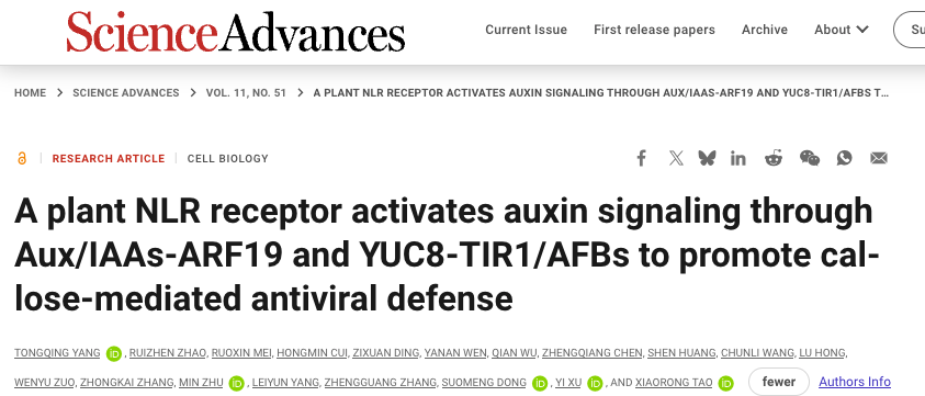 近日,南京农业大学植物保护学院陶小荣教授团队在国际权威学术期刊《科学·进展》(Science Advances)在线发表了题为A plant NLR receptor activates auxin signaling through Aux/IAAs-ARF19 and YUC8-TIR1/AFBs to promote callose-mediated antiviral defense的研究论文。该研究揭示了NLR免疫受体Sw-5b通过Aux/IAAs-ARF19与YUC8-TIR1/AFBs模块启动和放大生长素信号通路进而促进胼胝质介导的抗病毒免疫的机制。