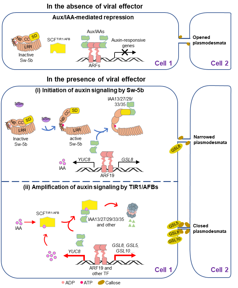 生长素响应因子ARF(auxin response factor)是生长素信号通路中的转录因子,通过结合靶标基因启动子区的生长素响应元件AuxRE来调控生长素介导的生理过程。在胞内生长素(吲哚乙酸,IAA)浓度低时,ARF被转录抑制因子Aux/IAAs结合并阻止其启动下游基因的转录调节。该研究发现Sw-5b激活后通过SD结构域与多个Aux/IAA蛋白互作进而解除后者对转录因子ARF19的抑制。ARF19随后直接结合GLS8启动子促进胞间连丝胼胝质的积累。