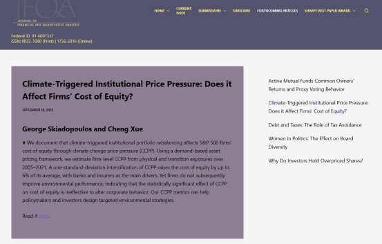 在金融学顶刊Journal of Financial and Quantitative Analysis发表论文