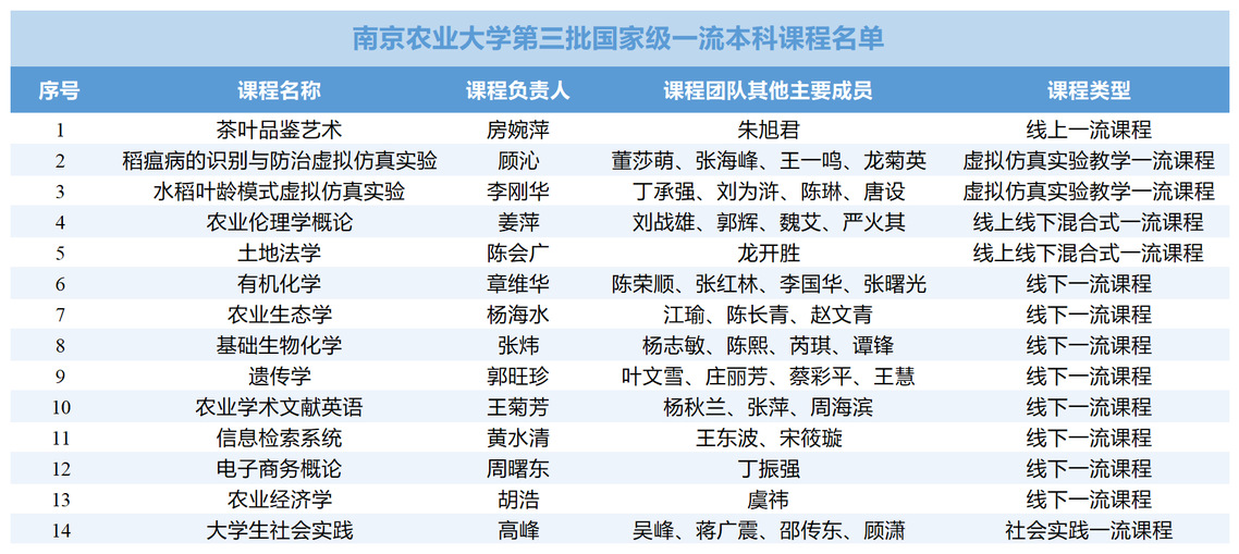 近日,教育部正式公布第三批国家级一流本科课程认定结果,南京农业大学14门课程入选,其中线上一流课程1门,虚拟仿真实验教学一流课程2门,线上线下混合式一流课程2门,线下一流课程8门,社会实践一流课程1门。