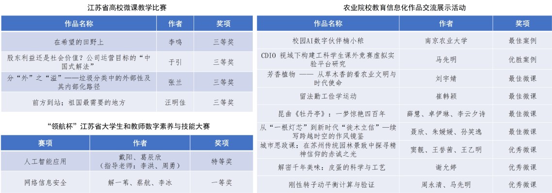 在江苏省高校微课教学比赛中,《在希望的田野上》(李鸣)等4项作品荣获三等奖;在“领航杯”江苏省大学生和教师数字素养与技能大赛中, 2项作品分获人工智能应用、网络信息安全赛项特等奖(戴阳、葛辰欣)、一等奖(解一苇、蔡航、李冰); 在全国涉农高校信息化作品交流展示中,《校园AI数字伙伴楠小秾》等2个案例分别获评AI赋能教育创新最佳案例和优胜案例,《芳香植物——从草木香韵看农业文明与时代使命》(刘宇婧)等10项微课作品荣获最佳微课和优秀微课。