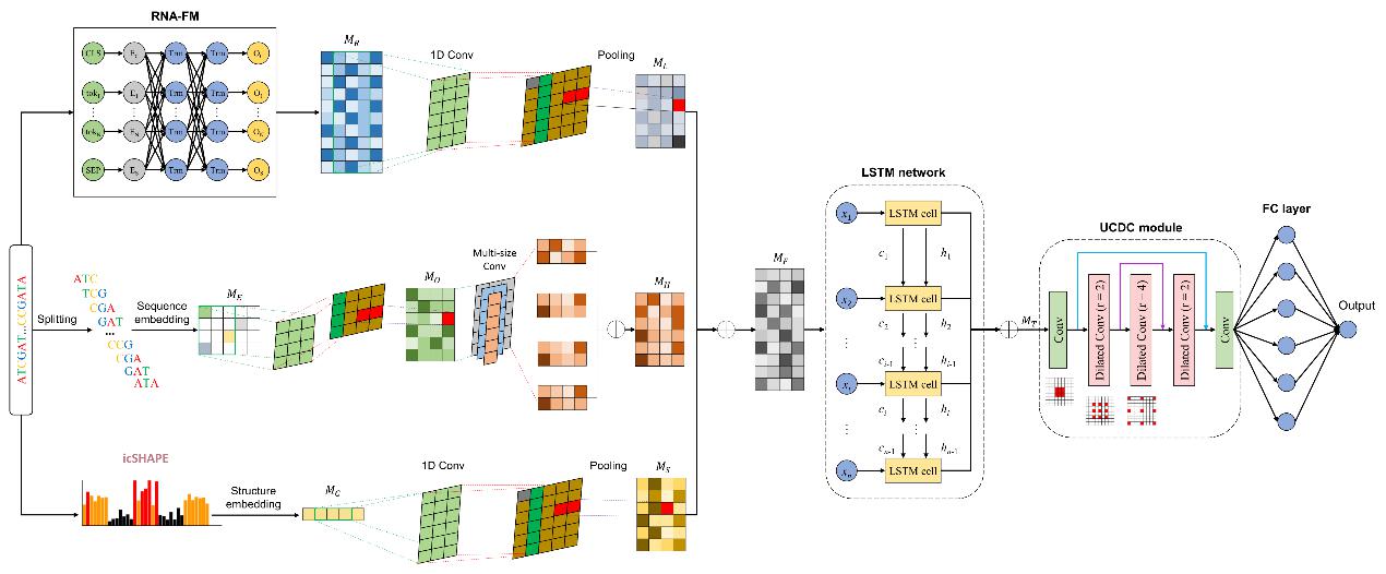 据悉,该团队成功研发了一个名为MsipNet的多尺度表示学习框架,可实现对蛋白质-RNA相互作用的高精度预测(图1)。这个计算框架首先通过多模态表示学习模块,整合RNA序列的全局和局部特征并融合RNA结构信息(基于icSHAPE数据),形成全面的特征表示;随后,借助LSTM与UCDC(U形卷积-空洞卷积)网络的协同优化,对多尺度特征进行深层次提炼与融合;最终输出准确的RNA结合偏好预测结果。该设计以模块化、连贯的架构突出了多尺度特征学习在提升预测性能中的关键作用,为RNA功能机制解析及相关药物设计提供了高效计算工具。