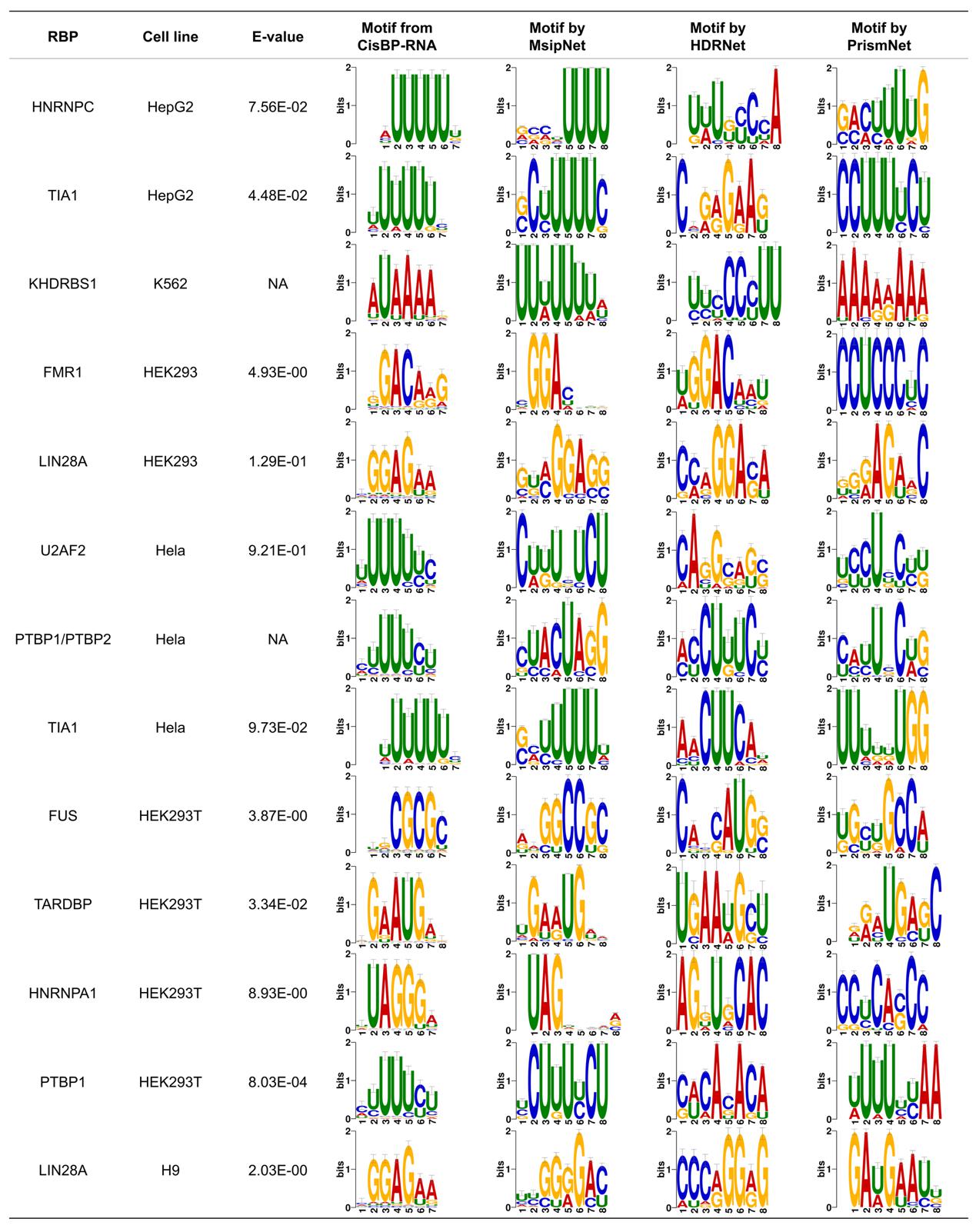 图2. MsipNet在42个RBP数据集中识别出13个经数据库报道的RNA结合motif